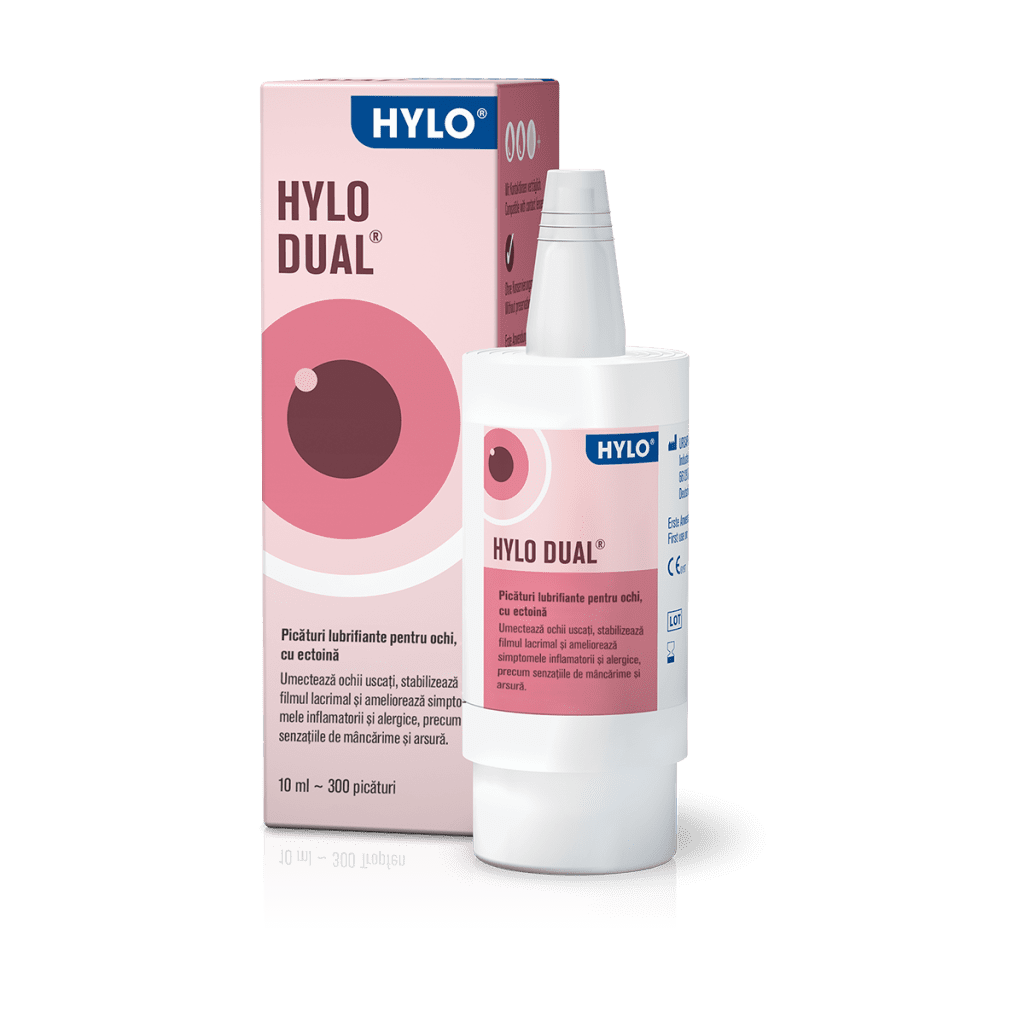Hylo Dual este destinat persoanelor care se confruntă atât cu uscăciune oculară, cât și cu simptome alergice precum mâncărimea, roșeața sau lăcrimarea.